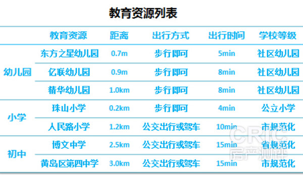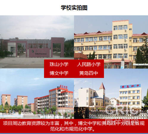 社区主入口正对珠山小学,公立小学,是2010年将袁家庄、孟家庄、小台后三处薄弱小学合并,建成并投入使用的一现代化学校,教育水平较好,也是项目的对口小学,另有市规范化小学——人民路小学,建于1937年,是胶南县城建校最早的小学, 2006年学校被评为青岛市规范化学校、青岛市绿化先进单位、青岛市AA级健康校园、胶南市素质目标考核优秀单位、胶南市语言文字规范化学校。乘坐公交车仅需2-3站。 在中学方面,博文中学建于2001年6月,胶南市唯一一所寄宿制初中,山东省规范化学校。教育资质无用质疑,且距离项目也只有6站的距离。黄岛区第四中学青岛市规范化学校,教育资质仅次于博文中学,但学校居项目过远,需进过6个路口,上下学多有不便。